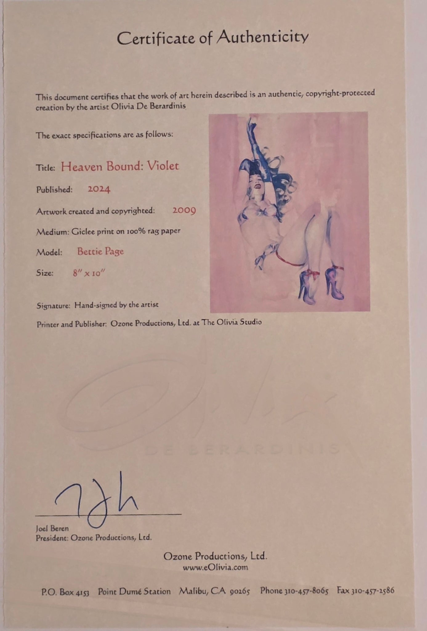 8X10 SIGNED OLIVIA DE BERARDNIS "HEAVEN BOUND VIOLET" GICLEE PRINT W/ COA